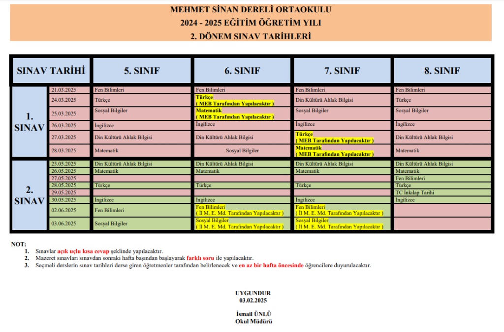 Mehmet Sinan Dereli Ortaokulu Ders Giriş Çıkış Saatleri