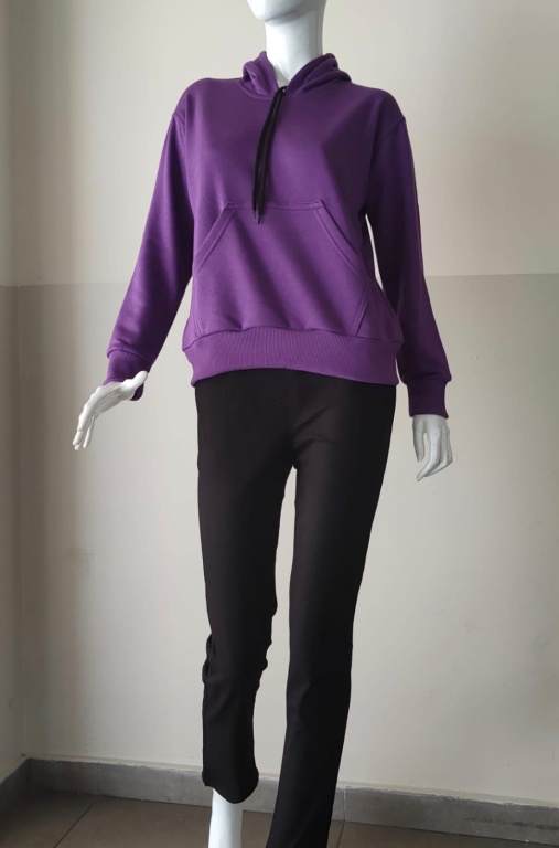 * Doğal ve sağlıklı kumaşlardan (pamuklu), mor renkli, fermuarsız kapüşonlu (kanguru cepli olabilir) Sweatshirt