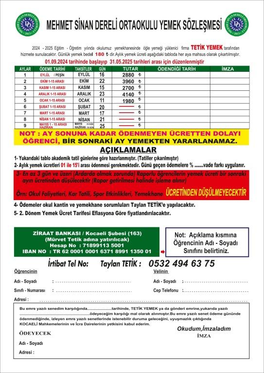 09 Eylül 2025 SALI günü okulumuzda yemek hizmeti başlayacaktır. Günlük yemek bedeli 180.00TL’dir. Eylül ayı 16 İş günü olup aylık yemek bedeli 2.880,00TL’dir. Ödemenizi TR62 0001 0001 6371 8991 1350 01 İban TETİK YEMEK Mürvet TETİK adlı hesaba açıklama kısmına Öğrenci Adı Soyadı ve Sınıfını belirterek yatırabilirsiniz.